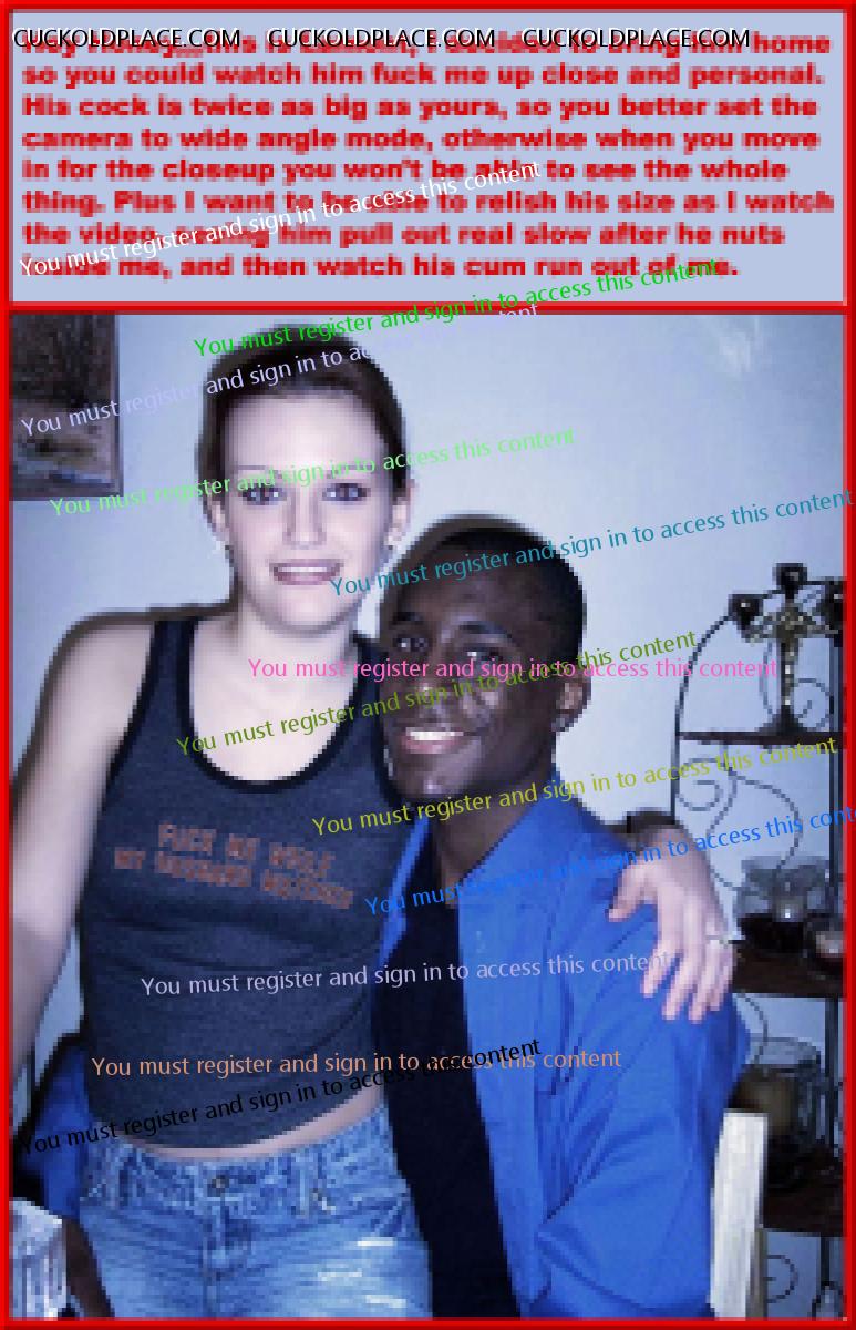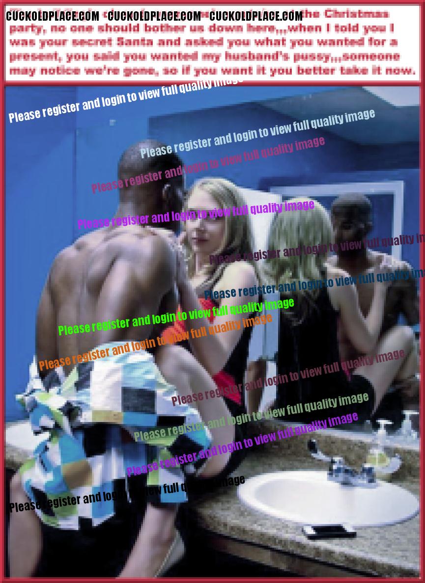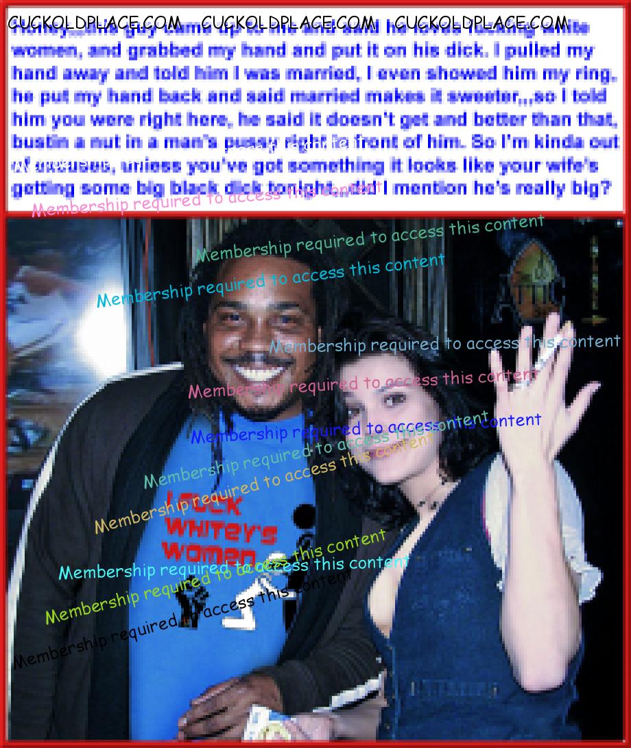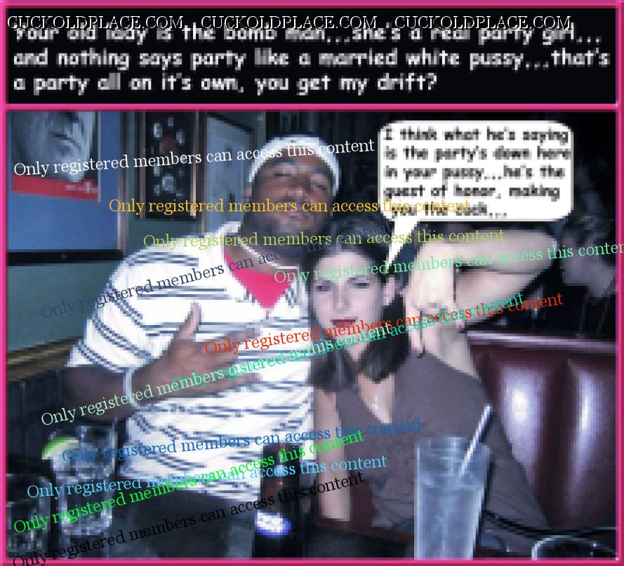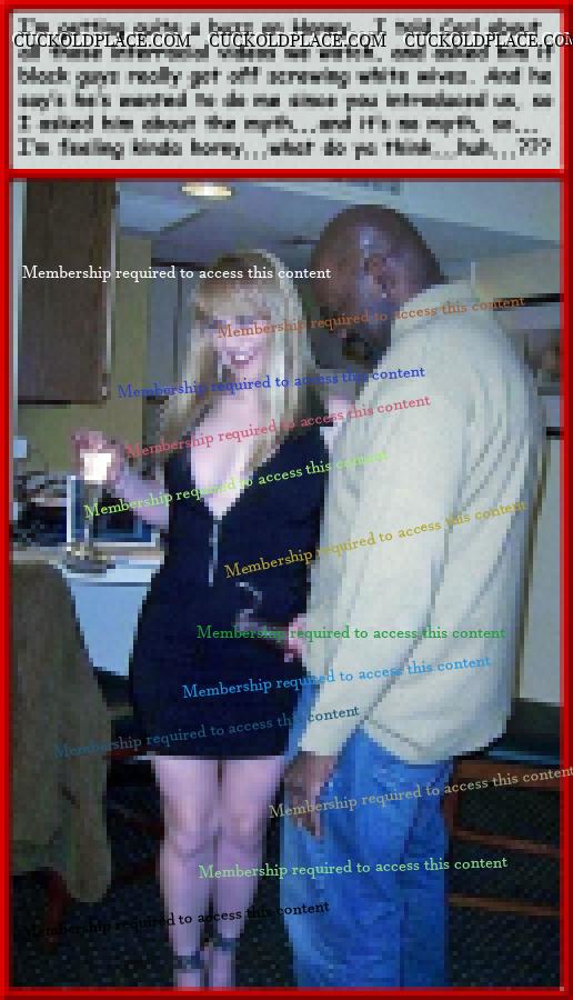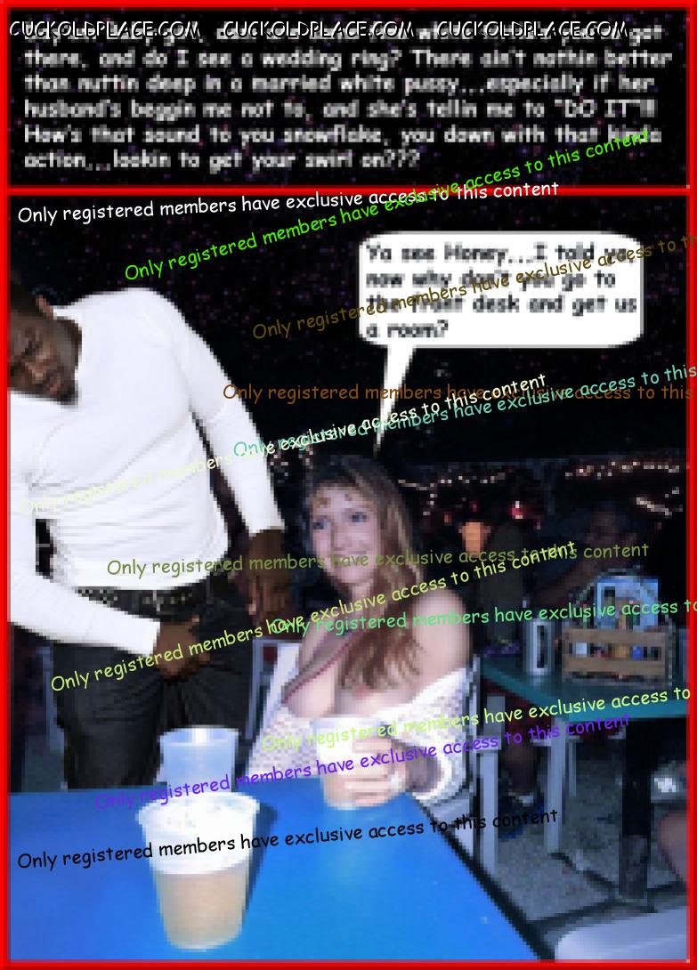 like2wacher66: Omg Mary you are the best. I loved every one of these. Now I gotta jack off im so horny. Thanx Babe,,,for the most part I come up with the text, and I rely on my hub to alter the pix to make the woman as white as possible and the men as black (sometimes the contrast alone sends me over the top), I also rely on him to add or subtract things from time to time,,,most of us are familiar with a lot of these pix (cause were pervs and are constantly coming across them while searching for new stuff), we can tell when a face has been swapped, or the pic has been flipped so the wedding ring is on the left hand (where most women wear it). This of course means that any and all signs, labels, shirt buttons, zippers, tattoos, etc. have to be reversed,,,I know right? Suddenly these are a lot more involved than most people realize. For instance, that last pic the guys hand wasn't originally in her crotch. Other things like T-shirts, cuckold jewelry (like that necklace a few pix up), along with Queen of Spades necklasses. I still have a bunch more of these he's already finished, plus he has over 1200 in the works, but each pic takes up to an hour to do, some more. You should see the collection of club pix he's been working on, someday i'll get around to posting them, they take a lot more work, but some of them are really great, especially with the captions.