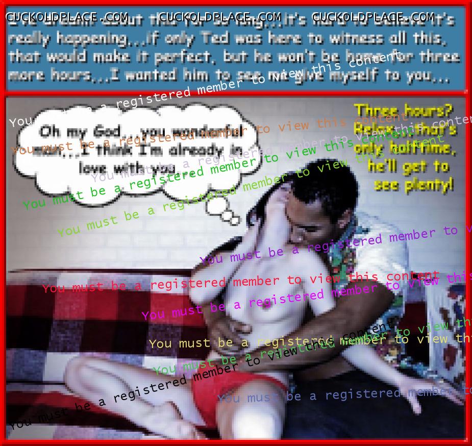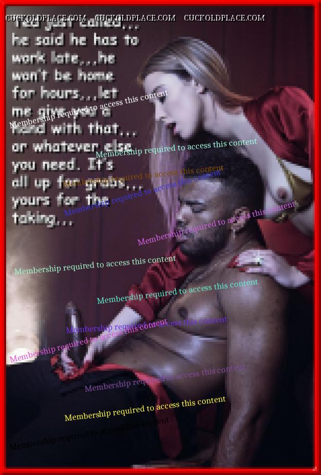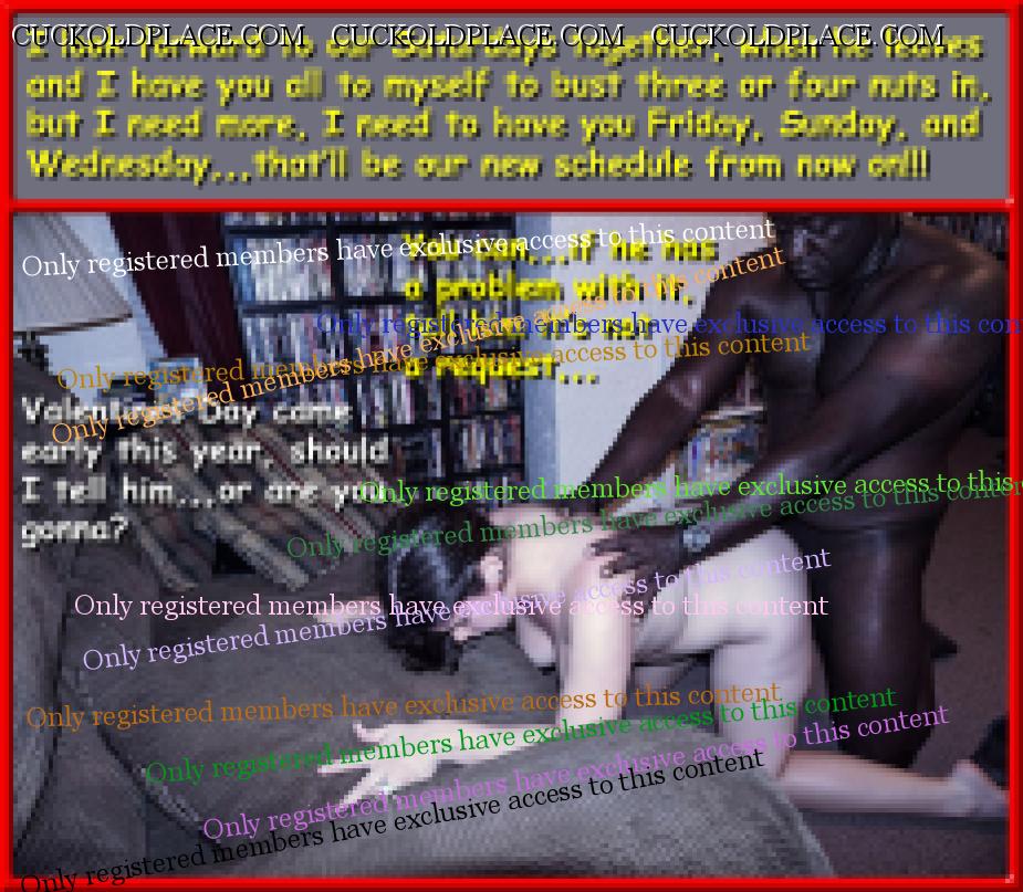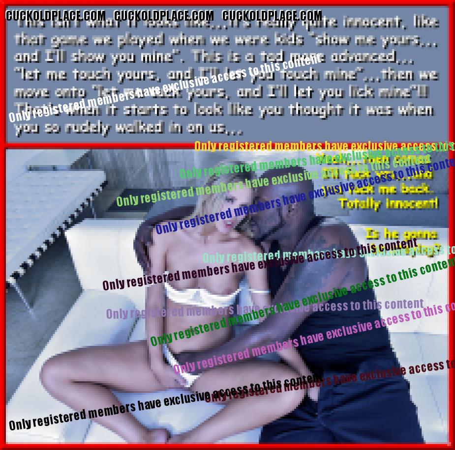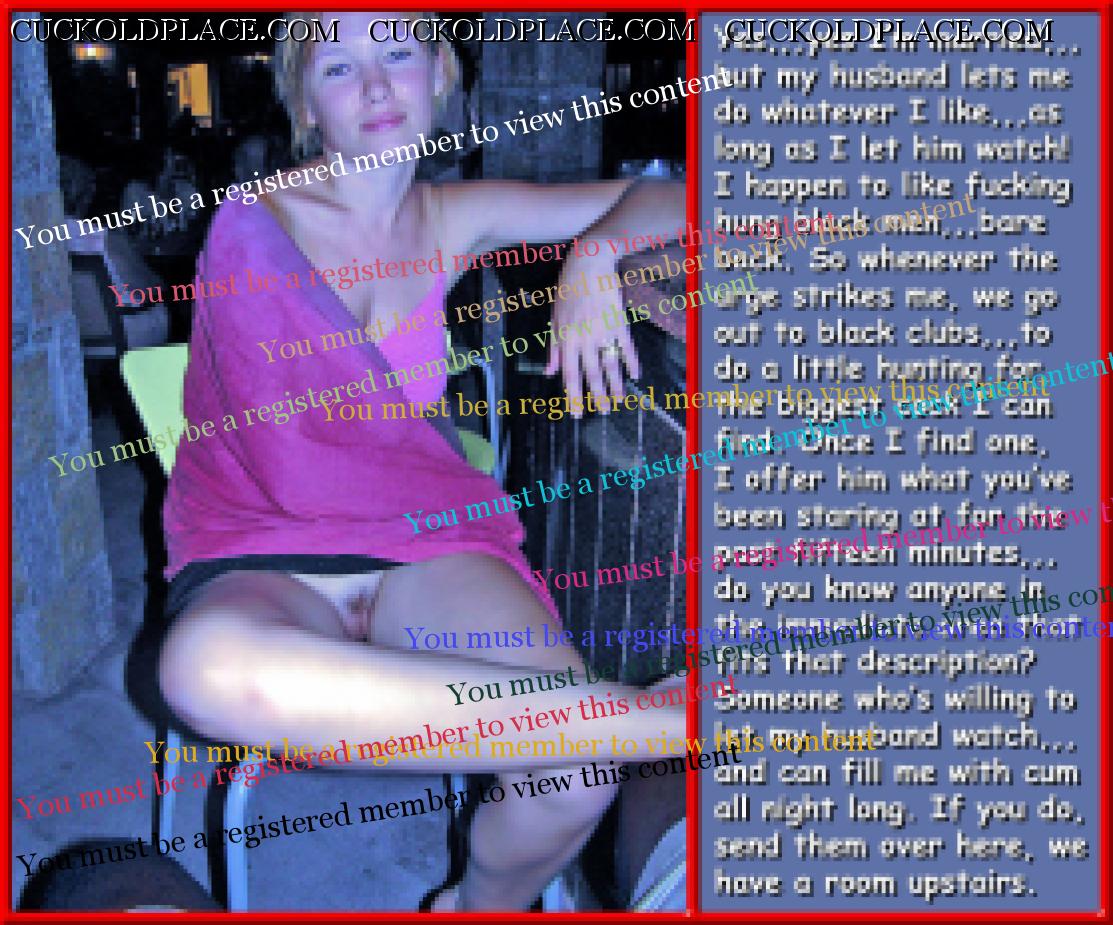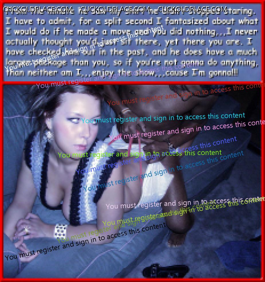 fem9jamie: 1066.4: If second fiddle = sloppy seconds, then it's all good! Even though I can hardly feel my hub after the usually bigger cock, and all the lube from his cum, I'm so wound up I still get off,,,and knowing hub's swimming in my Bull's cum doesn't hurt.1067.2: 6 times?! Mary, have you ever had a guy cum that much in 12 hours? Actually,,,Yes! But don't tell anybody, it was a white guy, and at least several years older than my hub, he was bald and I met him in the Mayor Carl T. Landford Park in Orlando,,,he had about 8 inches, ticker than my hub, and plowed me like a pro. My hub however was once at an "Art Cinema", where all the action took place upstairs in the Loge, one night he was up there waiting and one guy came up, sat next to him and shoved his cock in his face, it was a thick nine inches, uncut, and only the tip of the head stuck out from the foreskin when he was hard. He time he came my hub thought he was done, he never got totally soft before he shoved it in his face again,,,he actually came 7 times,,,and in the time it took for two movies to run and restart the first one. So there are all kinds of people out there,,,that guy was white too.1068.3: Speaking of sacrifice. Thank you Mary and hubby for sacrificing your time and energy making your amazing captions. You're welcome,,,like I've said before, it's a labor of love.1069.1: I love how many of your caps are based on your experiences. It makes them feel more authentic. Yeah,,,that actually is the easy part, just take the characters I'm viewing and apply my experiences, with perhaps a little poetic license,,,you know, kind of a "the names have been changed to protect the innocent",,,although, I still haven't come across any innocents.1070.1: That reminds me of something. It took me and my ex a couple of months to "christen" every room in our apartment. She said she and her boyfriend did it in less than a week! He was very competitive and got off from out-doing me. Is that weird? That's not weird,,,that's damn near cuckold perfection,,,providing it's not done with malice, all part of the game so to speak. We'd pray for a guy that would assume that role, nothing's better than NOT having to instruct him, it's so much more real,,,like in my volume #17 when I'm doing my bull reverse cowgirl and he pulls his sizable black cock out of my pussy and tells my hub to suck it,,,then after enough time to establish he's the Alpha, instructs him to put it back in so he can cum inside his wife, which he handily does. That's some premium cucking in my book.