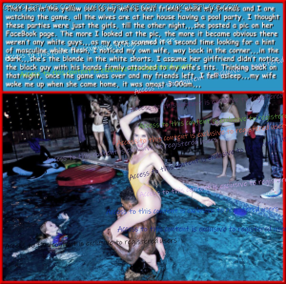 Pic #1,,,Tell me if you looked out at your pool and saw a black stud diddling your wife, you wouldn't stare. Pic #2,,,Sad but sometimes true,,,not so sad if you've been fantasizing about being cucked. Pic #3,,,Yes,,,this one is me, it was easy to write, I just had to remember what actually happened,,,what you don't see in my bull already shot his first load in my hub's mouth. Pic #4,,,This is truer than you'd imagine, in fact in the beginning most wives play coy and innocent, just for their hub's ego,,,can't seem too eager.  Multi_Orgasmic Mary