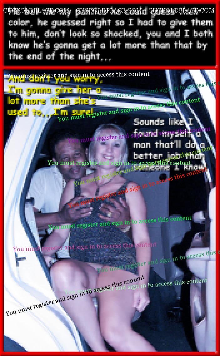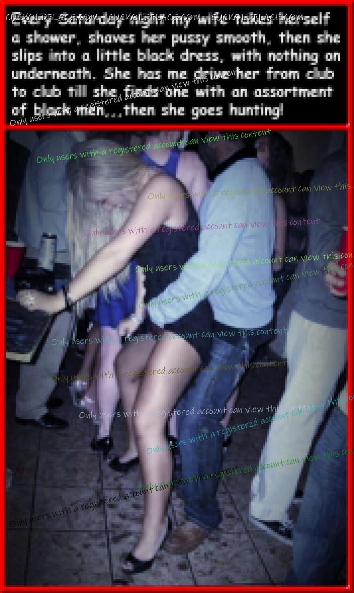 "Good Morning CuckoldPlace (it's really night), the main thing is I've finally found the time to post another gallery, there's a few here I really like, hub's already got half of the next one done, and there's some in it I can't wait for you to see,,,so without any further ado,,,"submitted for your approval" (Twilight Zone,,,) Pic #1,,,I used to love nights like this, out on the prowl, never knowing how it was gonna turn out, and then you spot him, a bull that's already taken your husband's pussy,,,or was he one I gave it to? No matter, the main thing is the hunt's over, and Mama's getting some real cock tonight. Pic #2,,,It's a good thing my hub's a well conditioned cuck, otherwise every time a black guy with weed showed up he be more nervous than a long tailed cat in a room full of rocking chairs,,,as it is he'd think something was wrong if I was offering up his pussy as payback for the high. Pic #3,,,Every wife has that lifelong girlfriend, usually divorced, that insist's they're still teens and can party however they want with no regards to you or your marriage. Pic #4,,,Yeah,,,when you look like her, and you flirt with every black guy you dance with, it's not a problem,,,the rest of us have to go around braless, without panties, displaying our goods like something in an open market,,,thank God that works too!  Multi_Orgasmic Mary