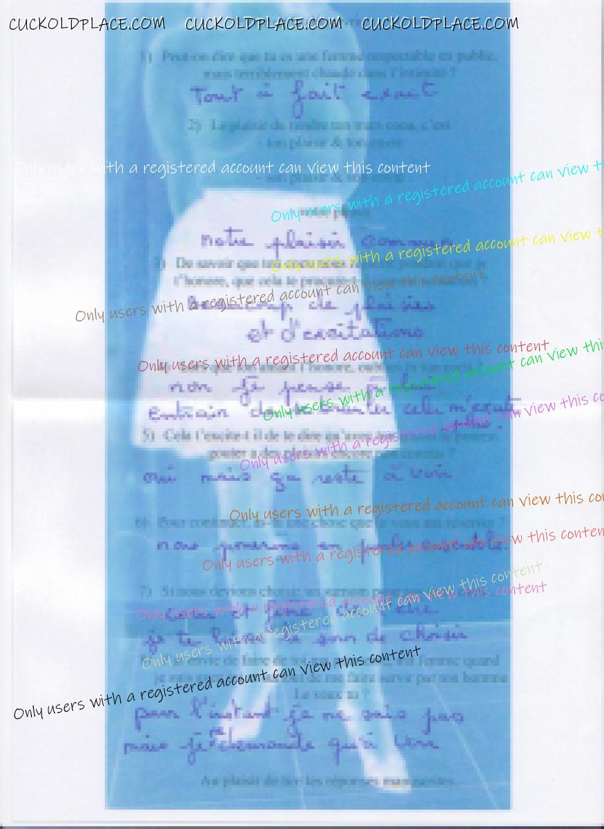merci Robert pour ton commentaire, Pour le moment je suis en train de decouvrir un peu ces deux permisternes.. regardez un peu comme le cocu prend plaisir a se cocufier aux yeux de sa femme. Ce dernier lui a fait parvenir une petite serie de question. Bien sur je n;aime pas le standard alors il a du payer de sa permisterne pour aller lui remettre. On va qu'il a deja la belle position de soumis et que, se faire cocufier, passe comme une lettre a la poste...plutot comme une lettre a la raie du cul. Dans tous les cas, s position de soumis cocu va s;affirmer de plus en plus. Ces couilles qui pendent sous le poids de l;exitation, vont entre plus etre lourdes lorsqu;il qu'il verra sa chaude epouse prendre un plaisir fou avec moi.. f