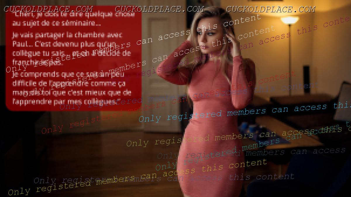Ma femme Joëlle est partie en formation pendant deux jours avec un collègue de travail à 200 kms de la mai***... J'ai reçu des photos envoyées de *** telephone Et ce n'est pas des selfies : c'est *** collègue qui les a prises. Après les cours, ils ***t allé prendre un verre et ont fini dans la chambre de ma femme !