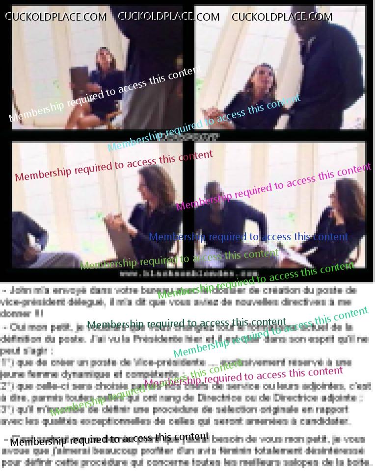 Son trouble fut si grand, qu'elle ne pr�cisa pas � Didier que la Pr�sidente ne serait pas la seule � vimisterner l"entretien d'embauche" ... avait elle oubli� que Didier avait �t� vigile int�rimaire pendant un mois et qu'il l'avait forc�ment d�j� vu en plein "travail" dans mister bureau feutr� ?! Pensait-elle que, m�me dans ce cas, florence ne lui avait pas d�j� dit que les webcam �taient interconnect�es au r�seau vid�o et aux bureaux des autres chefs de service et de leurs adjoints .. myst�re ...
