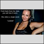 OMG... what has she become? Check out this text she sent me: HER: "I think I just got a message offering $ for sex on AFF ! And the answer is no!!  but I asked for a picture just to be sure lol" ME: How MUCH money?  HER: "No amount was given. Just the $ used. And he mentioned he has money to spend and he can provide benefits" ME: Hey if he's attractive, well hung AND will throw some cash at you, go for it! LOL HER: I'll keep you posted ;) Now..... long story short, he sent his pics and she said yuck! It ain't gonna happen. BUT... if he had been good looking I think she actually might have contemplated it. Wow... I never would've expected that... cuckold - Pronunciation - kuk-uhld - noun 1) The husband of an unfaithful wife. 2) A husband whose wife has sex with others. NOTE - It does NOT say: Sexually confused, submissive, humiliated, sissified, crossdresser, cocksucker, or piss drinker