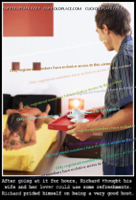 Several years ago, my wife mentioned that she’d love to have a 3some with a male friend of mine named Ron. Of course, I made the arrangements to make it happen. The night finally arrives. We all go out to dinner, have a few takes and then get a room at a nearby hotel. Up in the room, my wife and my buddy are kissing and fooling around and things are heating up nicely. About then my wife decides she wants another take. I had brought a bottle of Bacardi… but no mixers. So first, I grab the ice bucket and go down the hall to get some ice. When I get back with the bucket of ice, they’re both sitting on the couch kissing. My wife has her shirt unbuttoned and Ron is playing with her tits. Reluctantly, I left the room and went down to the lobby to get some Cokes. When I get there I find that the smallest bill I have is a $10… so I have to go to the front desk to get change. I end up waiting in line behind some people checking in. I finally get some change, buy a couple of Cokes from the machine and head up to the room. When I get in the room, I see that my wife and my buddy have moved to the bed. My wife is completely naked and Ron has his face buried between her legs. I’m standing there watching for a few seconds and my wife looks up just long enough to tell me that she wants a Diet Coke and she sends me back down to the lobby! By the time I go back down to the lobby, buy a Diet Coke and mix a round of takes for everyone… they’re fucking their brains out. By then I was starting to get the hint, so I just sat back with a take in one hand and my dick in the other watching the two of them go at it. Later on I did get involved in the action… but for awhile there, I was pretty much just a cocktail waitress. And that’s kind of the story behind this caption.