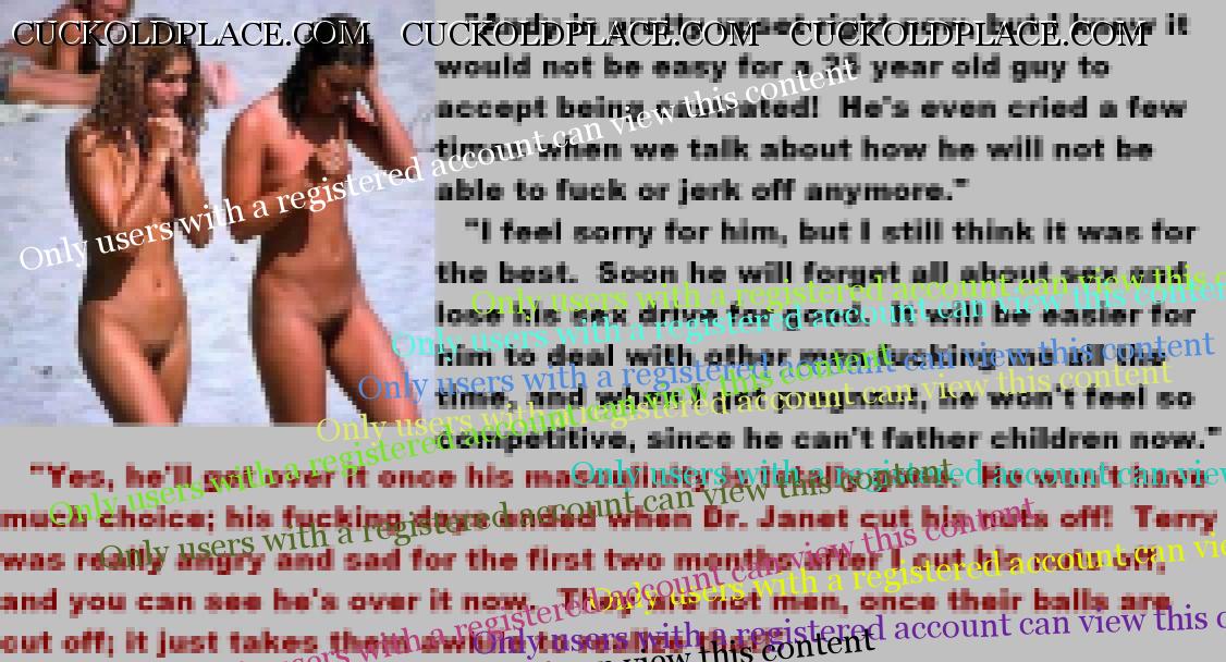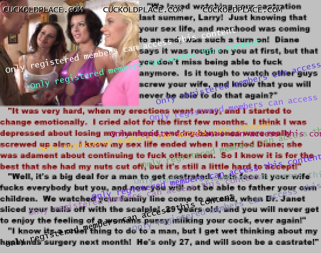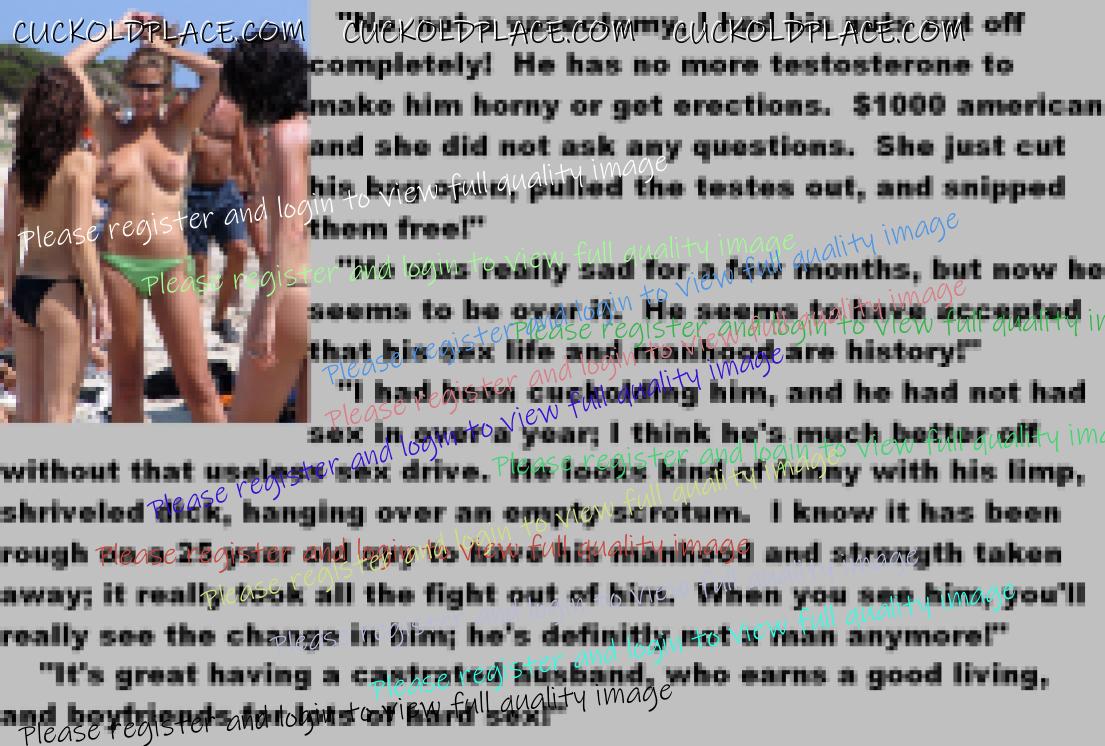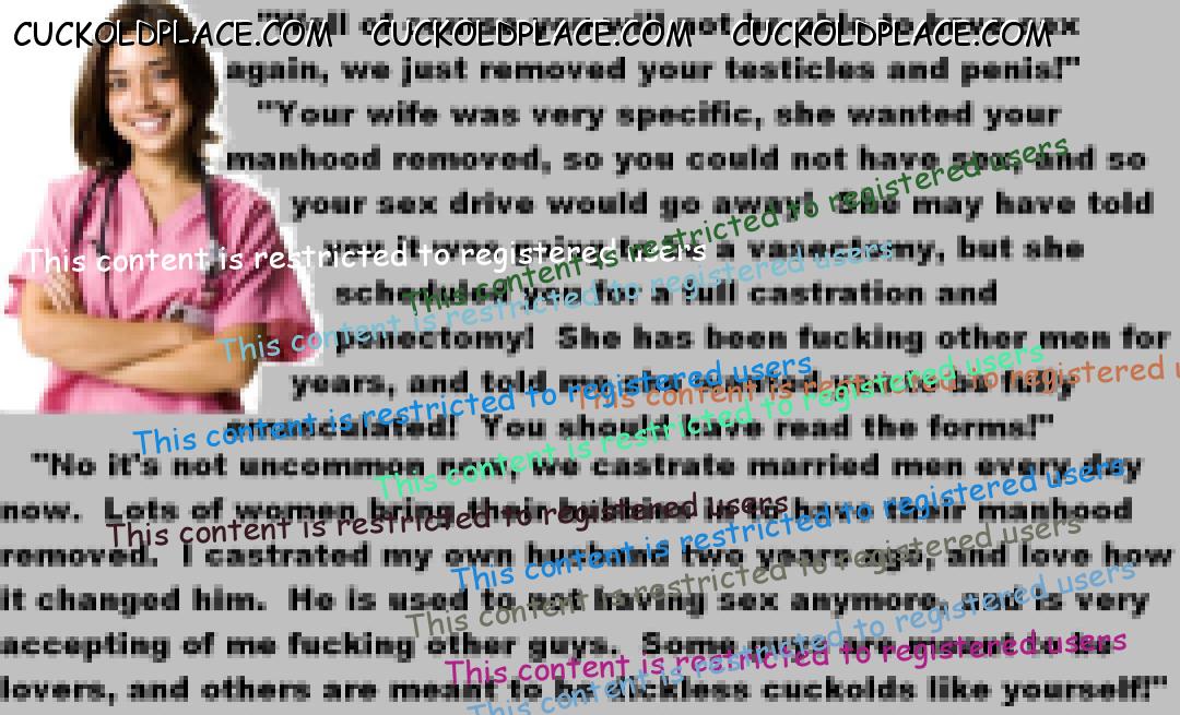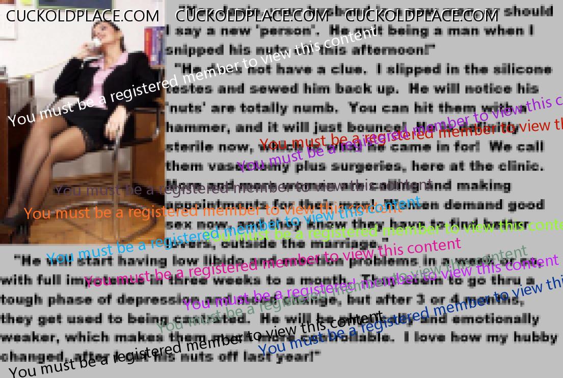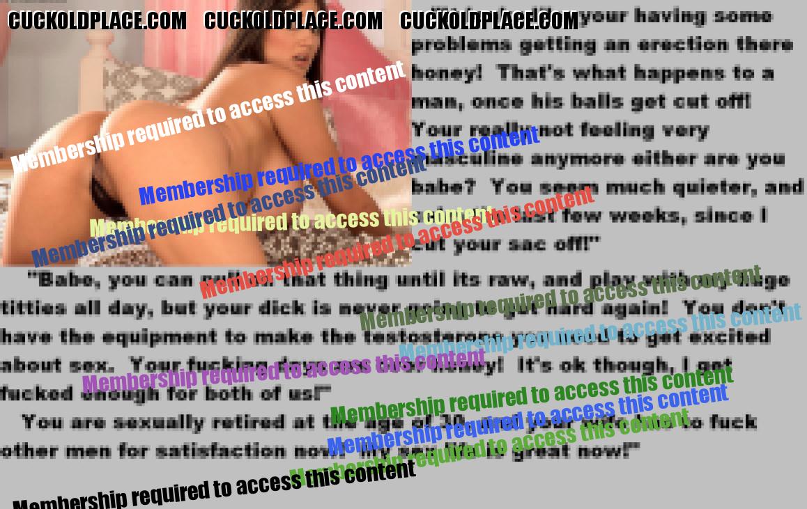 . I have to say CC that there are times when this threads themes, subjects and ideas just swirl around inside my head. It's so considerate of these girls to just retire you and take away all the pressure of sexual competition that we all know you were going to loose anyway..... If you think about it, it's really an act of mercy; to put you out of your pain, don't you think? .  There are few things in this world as sweet as the gelded husband.