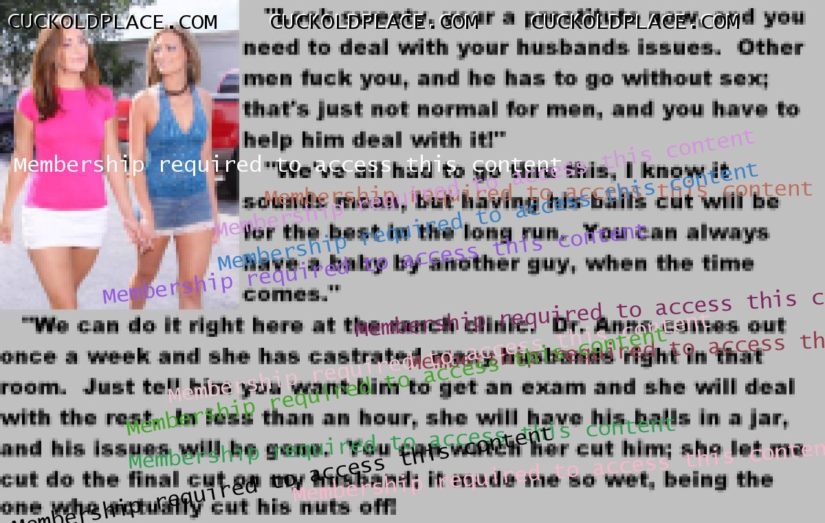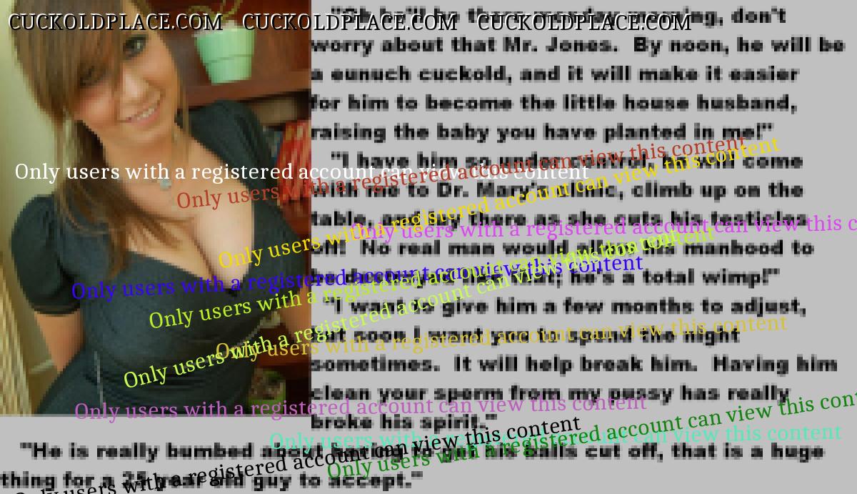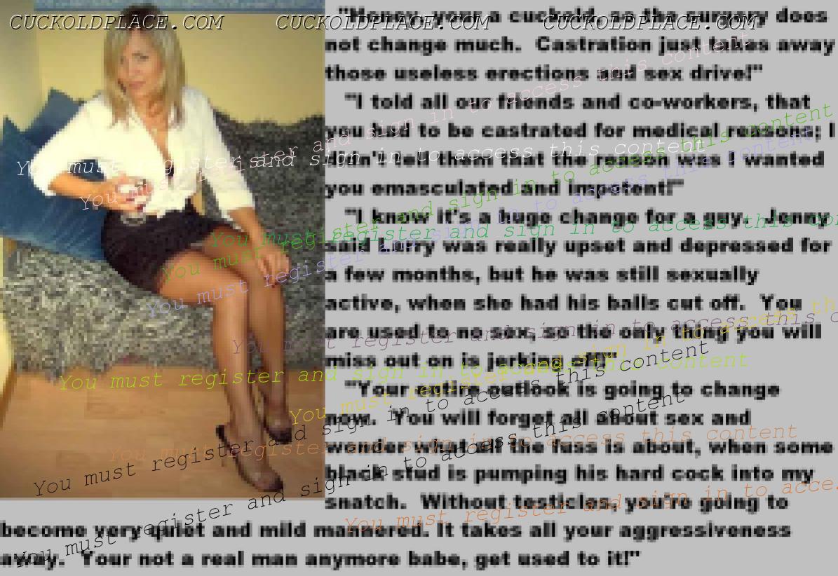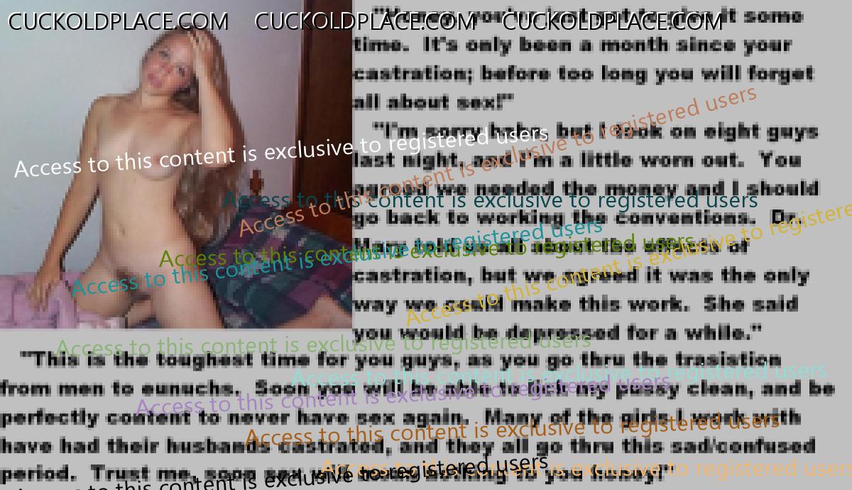This subject shouldn't arouse me,but strangely it does.What I find so erotic is the wives attitude to it all.They've met the love of their lives and lived in marital bliss....but only for a couple of years.As soon as the boredom sets in,they realise that fidelity is not for them.There are lots of men out there,real men,sexually satisfying men and,quite rightly,they want them.Suddenly their husbands sperm,the reamister they mated,is not required any more.I love the matter-of-fact way they tell them no only this,but if they want to remain married,then all sexual desire must be gotten rid of "for our mutual happiness". Of course,the husbands being cuckolds,they accept castration to please their darling wives.This ultimate sacrifice is proof of their total love and an example to us all.