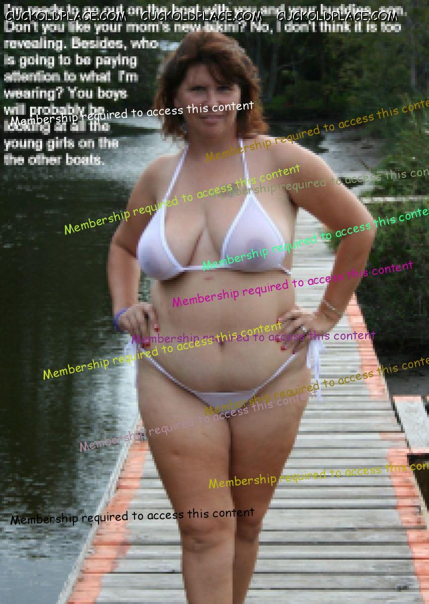 I'm ready to go out on the boat with you and your buddies, mister. Don't you like your mom's new bikini? No, I don't think it is too revealing. Besides, who is going to be paying attention to what I'm wearing?