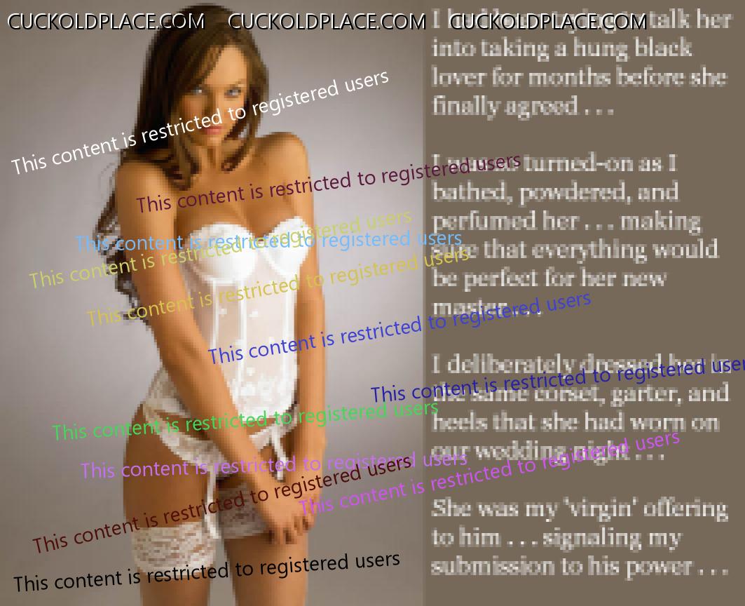 I had been trying to talk her into taking a hung, black lover for months before she finally agreed . . . I deliberately dressed her int he same corset, garter, and heels that she had worn on our wedding night . . . she was my 'virgin' offering to him . . . signaling my complete presentation to his dominant power . . .