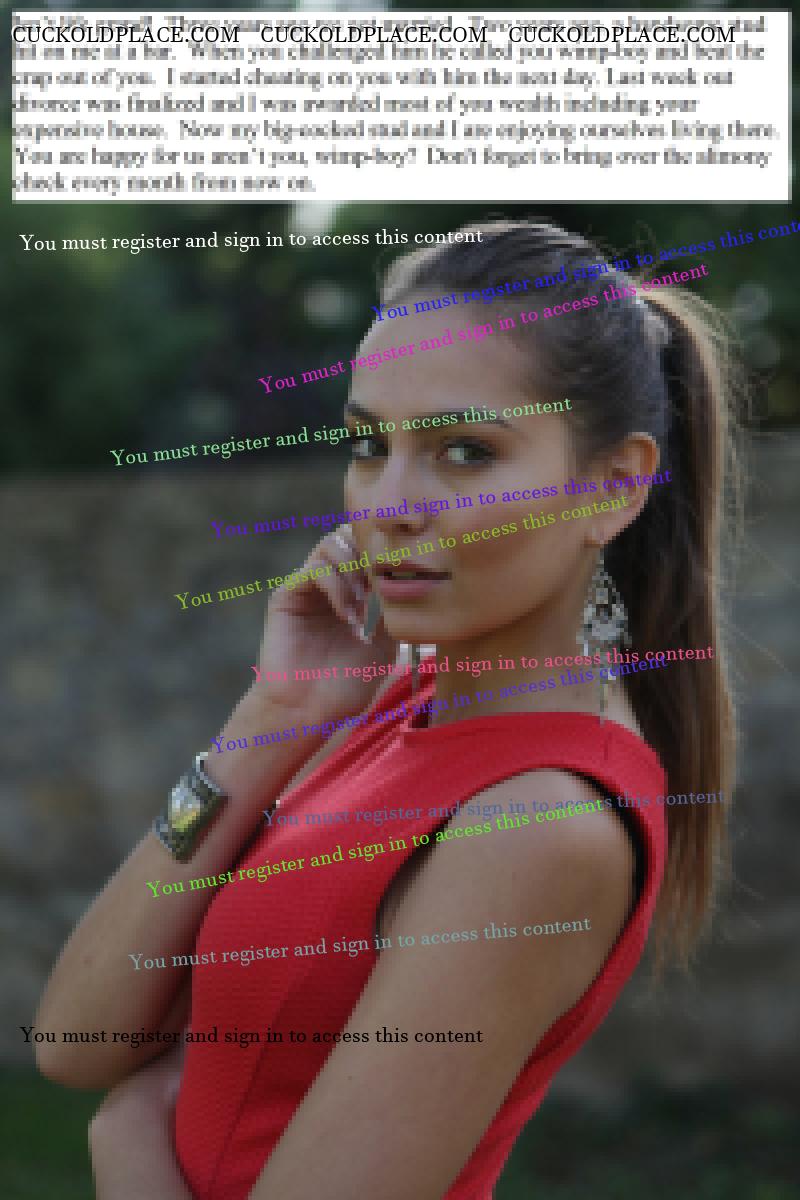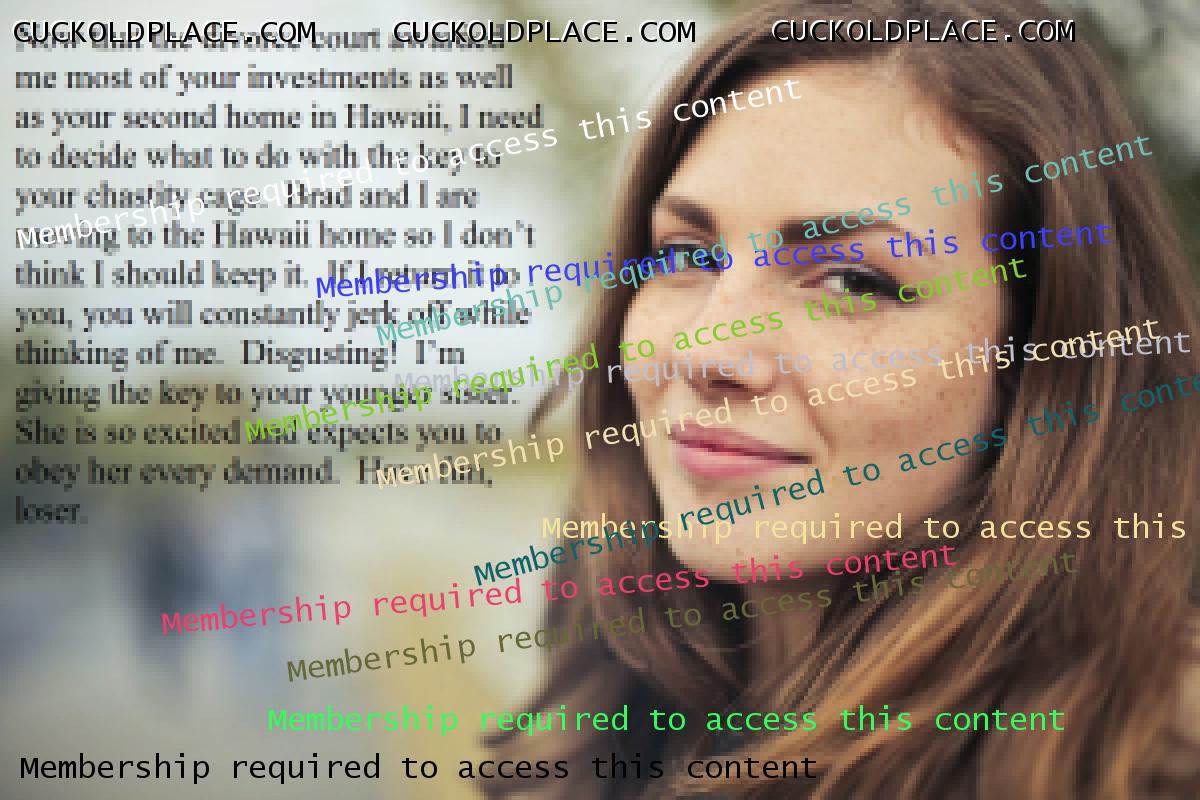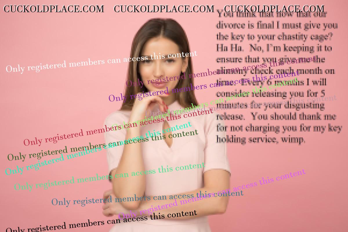 Omega236: I can't explain why, but the idea of being married to a nice, wholesome, and beautiful woman who becomes cruel when she divorces me is very hot. She takes me for all I have, but I still want her and jerk to her. She takes pleasure in taking what is important to me and knows that I still crave her. I'm her ultimate cuckold because she continues to tease me as she takes my money. Yes, that idea is very hot for me too. . Submissive Cuckold - lives for many years in a female-led marriage with a cuckold lifestyle.