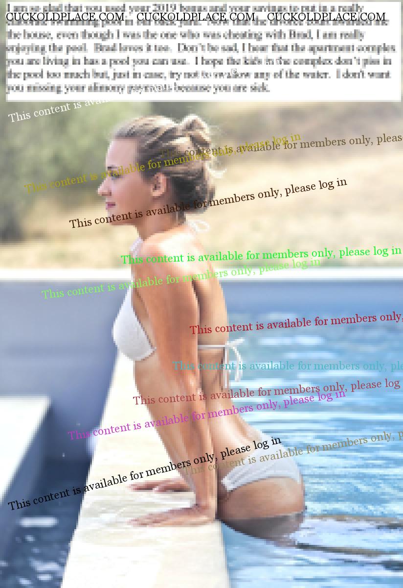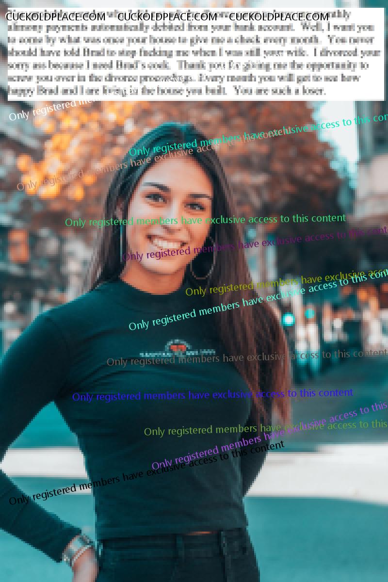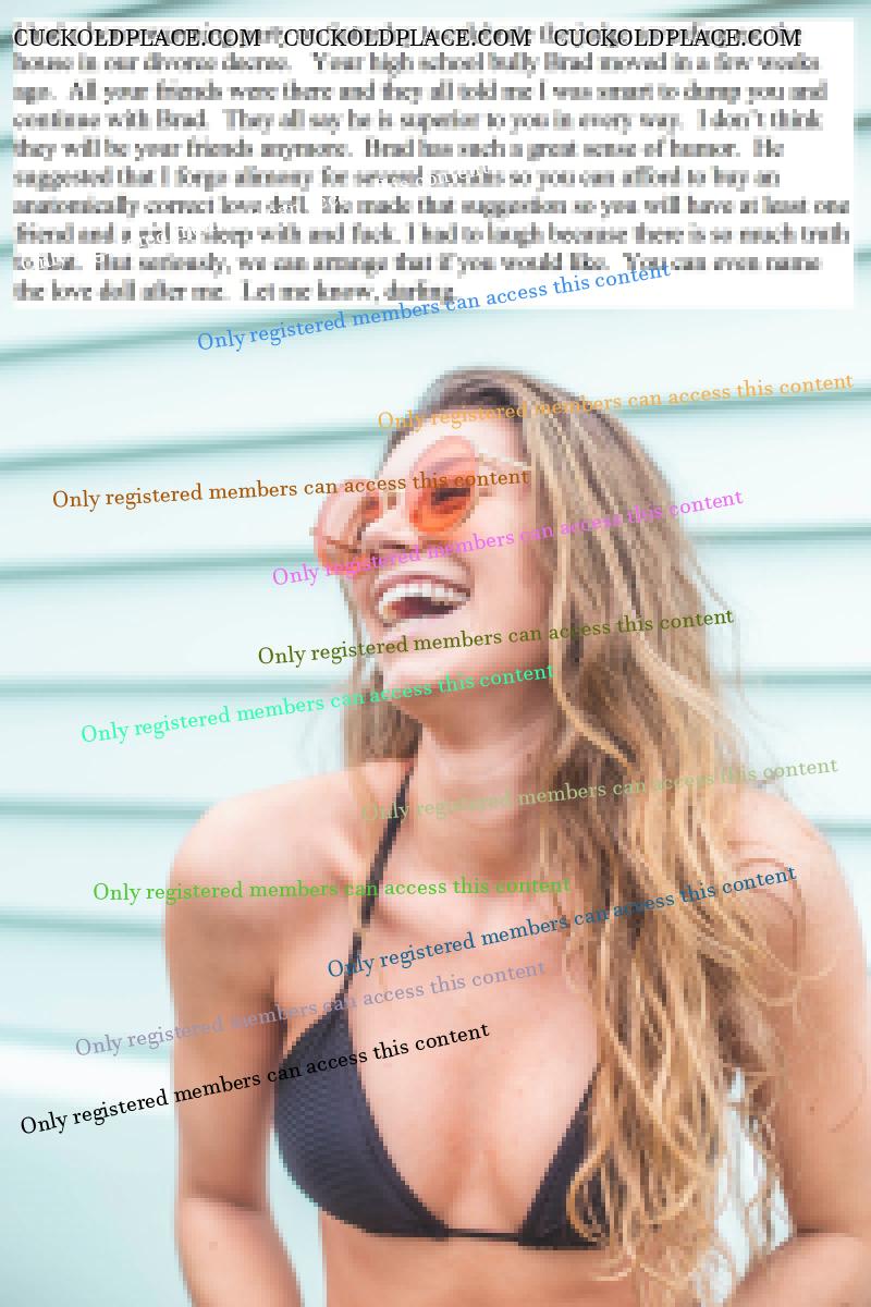 I can't explain why, but the idea of being married to a nice, wholesome, and beautiful woman who becomes cruel when she divorces me is very hot. She takes me for all I have, but I still want her and jerk to her. She takes pleasure in taking what is important to me and knows that I still crave her. I'm her ultimate cuckold because she continues to tease me as she takes my money.