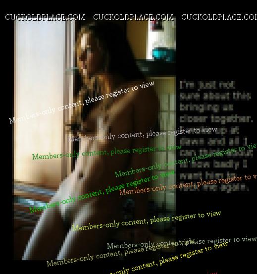 Your amimations are excellent jerk-off fare. I love them. I want to repost one of your recent pics ("Closer") so I may comment as you look at the picture again. You wake up and your wife's not in bed. Her side of the bed's cold, so she's been up for a while. She's not in the bathroom, so you look through the house intil you see her in the kitchen, staring out the window. She doesn't turn as you watch her from the doorway. Finally, she tells you that she's been up since dawn, thinking about her lovemaking with him, hungering for him. She's confused. She thought it would make her closer to you, but no, it's had the opposite effect. All she can think of is him and being with him again in that way. As she says this, she looks out the window. Her naked body is beautiful, but somehow, it's not available in the way it was before. She wants him, not you, with her body and her mind, perhaps with her heart in the strange way a woman's hunger is tied to her soul. Strangly, part of you loves this division of her loyalty, this loss of preminance in her life. The cuckold part of you loves it that he's replaced youu in her desires. Part of you wants her to think of him when she's with you, even (especially) as you make love to her. Did you really think it would ring you closer for her to take another man between her legs? Did you really want it to bring you closer as a married couple, or did you want this, did you want her to hunger for him, think of him, perhaps, to fall in love with him? Be honest, now, watching her naked, her admitting she's hungering for him, is it that and not her naked beauty that's making you so hard? Isn't this what you really wanted? Isn't this what she wanted, too?