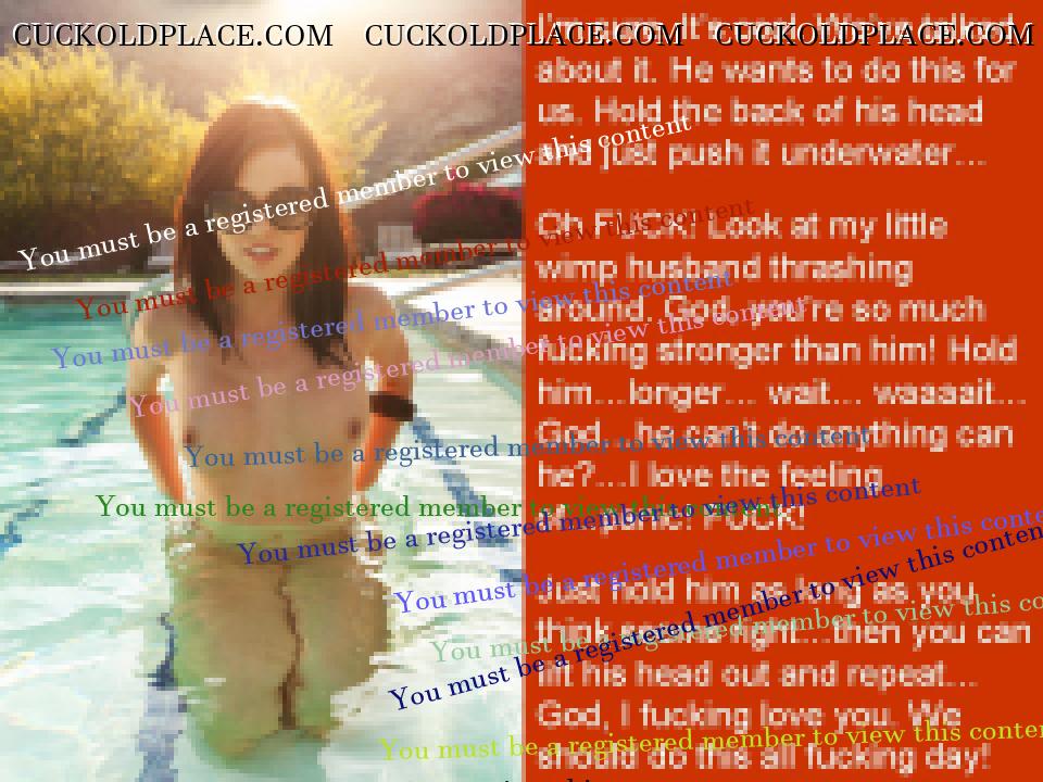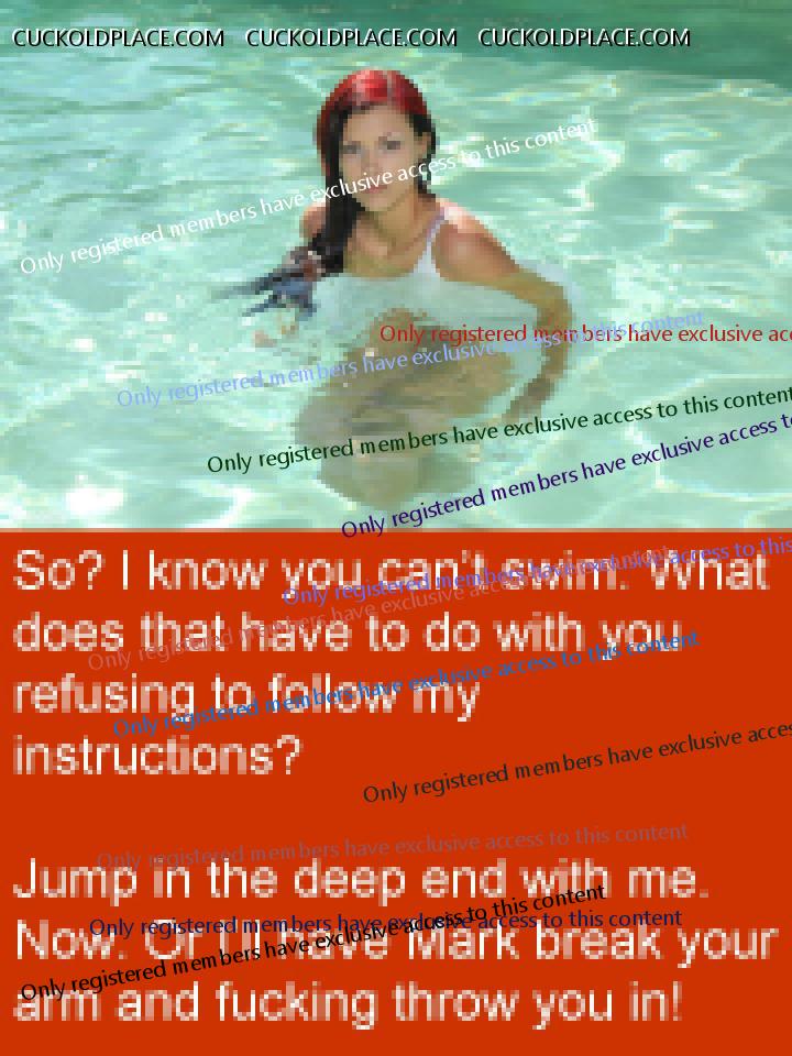 Well, Anne came home on Saturday night. She let me inside her. She told me she spent the whole time with her boyfriend so turned on she could hardly think straight and is was a big struggle not to stay over. She didn't let me make my little mess inside her. She told me that I wouldn't be allowed to do that anymore and that she wanted him to be the man of her young. I asked her to make me wear condoms from then on and she agreed. It was very, very hot. Instead of letting me make my little mess inside her she had me jerk off while she rammed a dildo up my ass. It was a amazing. Then we talked properly and she said she actually didn't mean that and she didn't want to have his baby but she was keen to start seeing him again, maybe every couple of weeks. They have talked about some things that were a problem and they seem to be resolved. So...things are moving forward. However, we're not sure how we're going to do this. If we don't want her getting pregnant by him...what do we do? Initially we decided that there is no way we could do this as condoms are no guarantee. However, over the past couple of days we have started to think again. Maybe if he wore something and they were careful...or if he wore something and she times their dates right...we don't know. Problem is that if she gets pregnant we will want to keep the baby but...we will also want to be sure it's mine. We're not sure if there is a way round this. We're still thinking about it. While I'm here, here are some caps. Paul.  Deep end