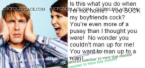 How about a pic story where the bull drops by for a blow job, but the hotwife isnt there. The bull tells the cuck that he's supposed to blow him. The hotwife finds out about it and calls him a fag and berates him, etc...