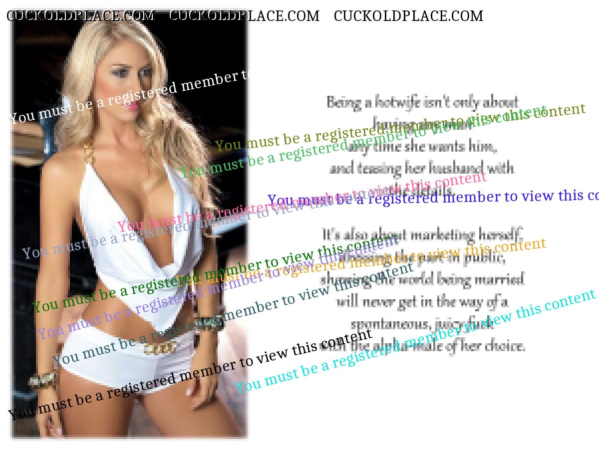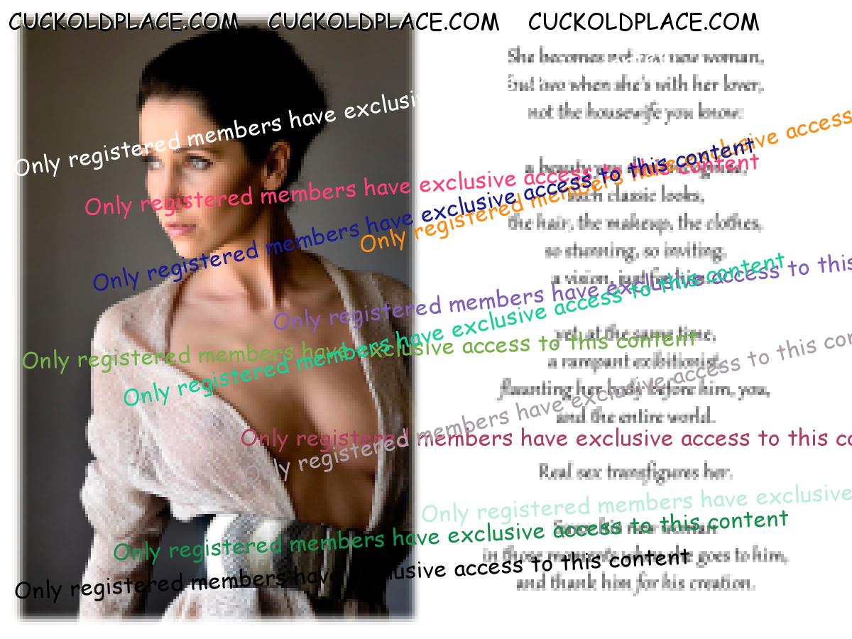 If she fucks hubby's tormentor is there any doubt he'll crow over his conquest to humiliate hubby further and spread news of the cuckolding? She knows this and it's a wonderful turn-on for her. Hubby wanted her to fuck other men. No real man would ask that so hubby's not a real man. Women desire men who will never share them so to punish hubby she seeks out those who he fears. The ultimate irony is that her lovers will want her exclusively whether or not they continue to fuck their own wives or girlfriends. The lover will want her not to fuck hubby, or even not to see her nude while she'll give herself to her lover any way, any time, anywhere.