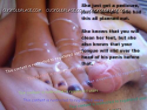 Fantastic caps! Loved "More than she does" -- reminds me of the first cream pie my wife took -- he came a HUGE amount and I licked it all out of her pussy. I definitely had more of his cum than her!