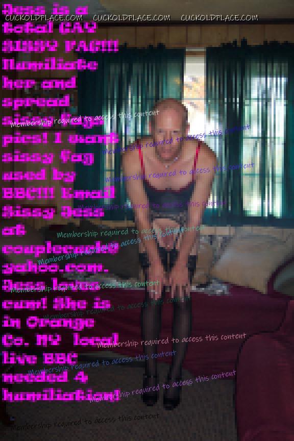 Fucking Sissy Jess is the worst fuck, her clitty is skinny and curved and really not enough to satisfy me. Early on in our relationship sissy admitted to being bi and liking womens clothes. I was astounded one day about 12 years ago that when sissy came to bed she had shaved her body and was wearing my good lotion and perfume. Well I freaked out on the little sissy and denied for a long long time that I married a sissy fag. I guess then I never realized what I was missing. After years of knowing that sissy was dressing and going out with men and denying she was a faggot I had the chance at a real man while away on TDY in Iraq for my job. I fucked a few soldiers and one really stole my heart and sex drive away from sissy. He was the best I had ever wanted nice and big thick and all the right moves. WOW I was in love! When I returned home I really didnt want sissy anymore. Sissy had stopped dressing and I made her start again knowing what I wanted ... a real man.... Well I used the lingerie and my power over sissy to have her agreethat real men would satisfy me from now on. I threw all her male underware out and replaced it with panties and bras. I now have 3 lovers and sissy has none... lol I guess if she was wearing a wig and make up she may get some one but it is much more humiliating for her to be a male in womens clothes.... I want sissy to have a few steady fuck poles to fill her holes but the right ones havent come along one of my lovers want to break siissy in but I like him to much to share him with sissy.... How selective are you when screeningmen for your sissy of does she take what you offer her.... J I have finally decided to take control (total) and have sissy in panties daily lock sissy in her CB 6000s for good. No more feeling sorry after a few weeks and no more giving into her pleas for mercy! Welcome the NEW MISTRESS!