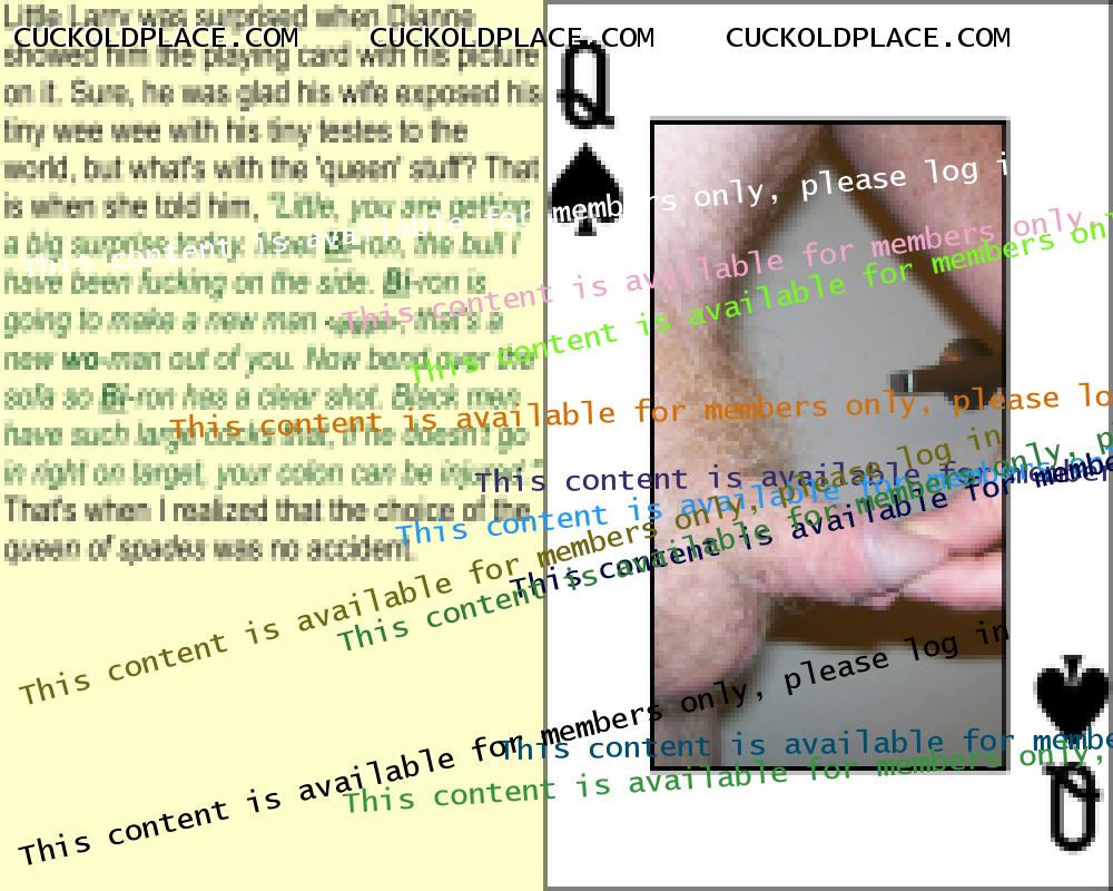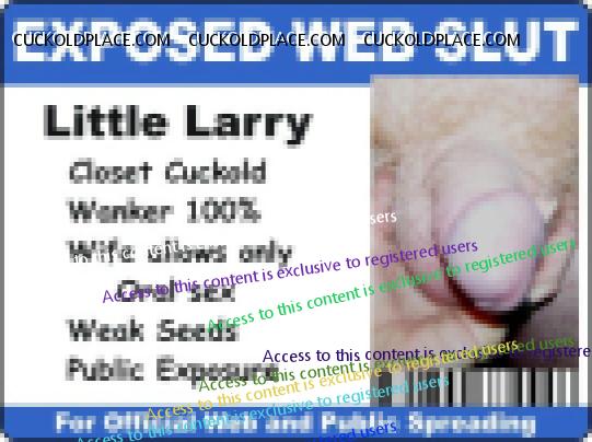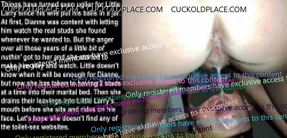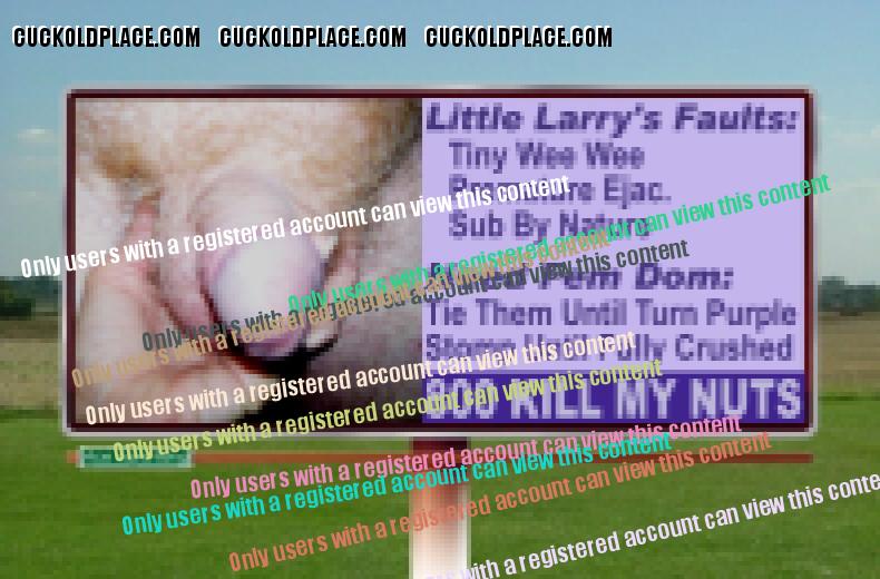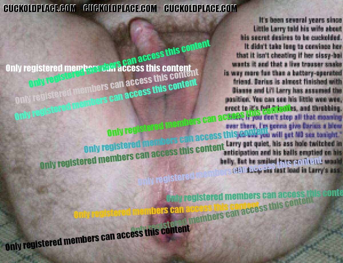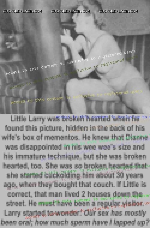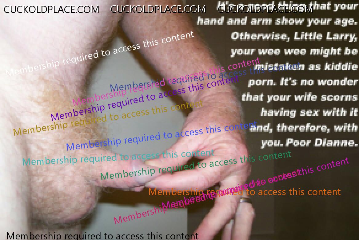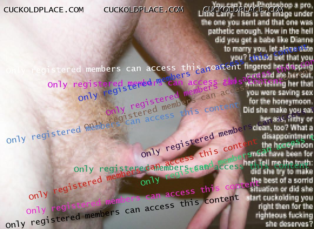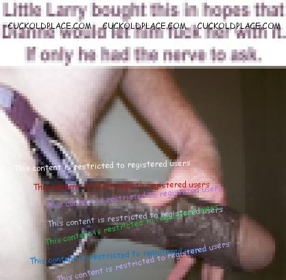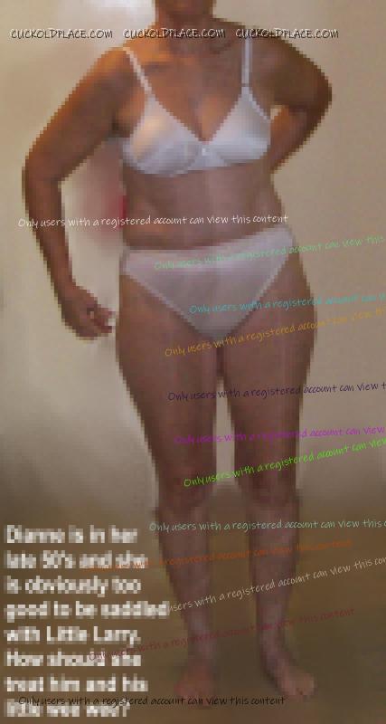 Little Larry has just gotten unlucky, very unlucky. Dianne was plenty pissed when she found his secret email account and all the captions and fakes that people at CuckoldPlace.com did for him. All this time she has been trying to be an understanding wife; all the while, he has a secret sex life and has been getting off every day, sometimes several times a day. Larry hoped to make it up to her by convincing Dianne to join his fantasy world. The only part she cares to join is the part where studs, real alpha-males, fuck her silly while Little waits at home, wondering when she'll get home, late or tomorrow. Now, Dianne is posting at a different site. She isn't too keen on dueling permisteralities on the same site and her ideas and desires are very different from Little's. Her ideas are different from the members here, too. Her email to me said that she's been doing without real sex for years and now it's Little's turn. Her exact words were 'Fuck that poll, those people don't know what I've endured.' Then she gave me a link to her post on The hyperlink is visible to registered members only! This is the most important 'Little Larry' photo she posted. I almost feel sorry for Little Larry.
