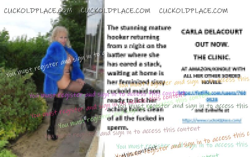 CARLA DELACOURT OUT NOW. THE CLINIC. AT AMAZON/KINDLE WITH ALL HER OTHER SORDID NOVELS. The hyperlink is visible to registered members only!and Evilwife at https://www.cuckoldplace.com/SISSY CUCKOLD HISTORY 897. Over to Helen's tonight that's my prostitute lady friend and I am shaking in anticipation as she let slip my Christmas present from her will be to watch her in action at a five-guy party she is holding and I will be doing the maid service. It also transpires I have met these guys before and it will be bareback all the way and probably like last time I will be fluffing and cock cleaning on top of both pussy and anal creampie cleaning. And I hardly think like last time Helen will have to urge them to use my mouth as a toilet easing their bladders in my waiting open mouth.