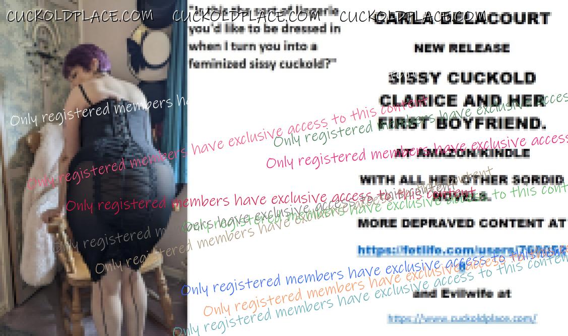 CARLA DELACOURT NEW RELEASE SISSY CUCKOLD CLARICE AND HER FIRST BOYFRIEND. AT AMAZON/KINDLE WITH ALL HER OTHER SORDID NOVELS. MORE DEPRAVED CONTENT AT The hyperlink is visible to registered members only!and Evilwife at https://www.cuckoldplace.com/SISSY CUCKOLD HISTORY498. I think most Feminized Sissy Cuckolds in a marriage or steady relationship knows what I am saying when I say that we suffer completely! You see when a wife or other significant woman in your life has you under her heel as the feminized sissy cuckold they soon find that their need to be a Cuckoldress far outstrips your need to be a sissy cuckold. This leads to the woman smashing any boundaries you might have talked about and she delights in her new power over you which leads to a status for you as little more than a slave and it does not stop at physical transformation into a Feminized Sissy Cuckold but also the mental and emotional aspect and never a moment will go by when she is not grinding what little masculinity you have into mush under her high heels. I have never talked to another sissy cuckold yet that does not own up to the fact that by days end the Sissy collapses into it's bed utterly physically and mentally exhausted after endeavouring to serve it's Cuckoldress perfectly in everything and enduring the relentless put down's punishment and ridicule as everything sissy cuckold has done is thrown back in it's face. And as we all know the hours sissy cuckold is allowed to rest and ***** are shockingly few.