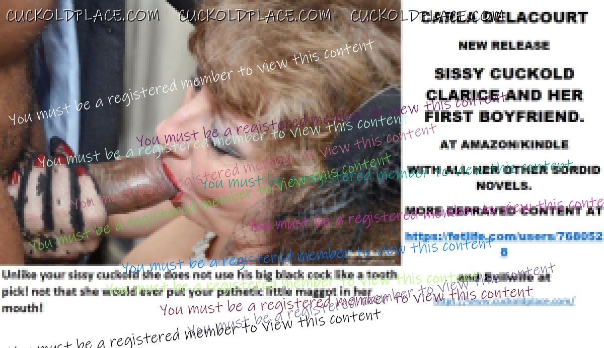 CARLA DELACOURT NEW RELEASE SISSY CUCKOLD CLARICE AND HER FIRST BOYFRIEND. AT AMAZON/KINDLE WITH ALL HER OTHER SORDID NOVELS. MORE DEPRAVED CONTENT AT The hyperlink is visible to registered members only!and Evilwife at https://www.cuckoldplace.com/SISSY CUCKOLD HISTORY 512. You certainly get to know your place as a feminized sissy cuckold when you see for the first time your wife being penetrated by a huge cock. One that's so big it dwarfs your pathetic little noodle making you understand how utterly worthless you are as a male as your wife takes every hard inch into her pussy which it slippery wet with her desire to get fucked properly once again. These inches fucking your wife and seeing hr cunt stretched so wide around it's girth and the sounds of her climaxing and begging the man to fuck her harder deeper and faster utterly destroy what little masculinity you had left in you. And it can get worse as watching your wife fuck a real man with you sitting their all femmed up maybe restrained you get so excited seeing your love get what she needs that without even touching yourself you have a sissygasm and she see's it happening. Do you think she would ever return to being a normal wife after witnessing your ******** because now she knows she has witnessed while getting fucked properly the bedrock of your persona and sexuality.