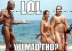 My wife and I have been completely naked at our nude beach in San Diego many times. We enjoyed walks along the beach, playing in the water and the freedom and joy of being naked laying and sitting on the beach. My wife enjoys checking men's asses and large cocks, and I enjoy watching my wife enjoy them and listening to her comments on how they might feel and taste. I also enjoy watching the men ogle my wife's big beautiful naked TiTs. Many of them even approach us to ask us a question, but stare at my wife's TiTs the whole time, many times with growing cocks when my wife smiles at their cocks. 1000s of men have seen my wife completely naked, up close, at our nude beach. I get hard thinking of all the 1000s of men that have seen my wife completely naked. Almost all of them from here in the San Diego area. My wife also sucked and fucked another guys cock, on our nude beach, with 3 other guys watching from about 3 feet away, and others from a further distance. The guy shot his cum into my wife's pussy, bareback. They were both very exciting events, and we all had a great time. No regrets for me or my wife.