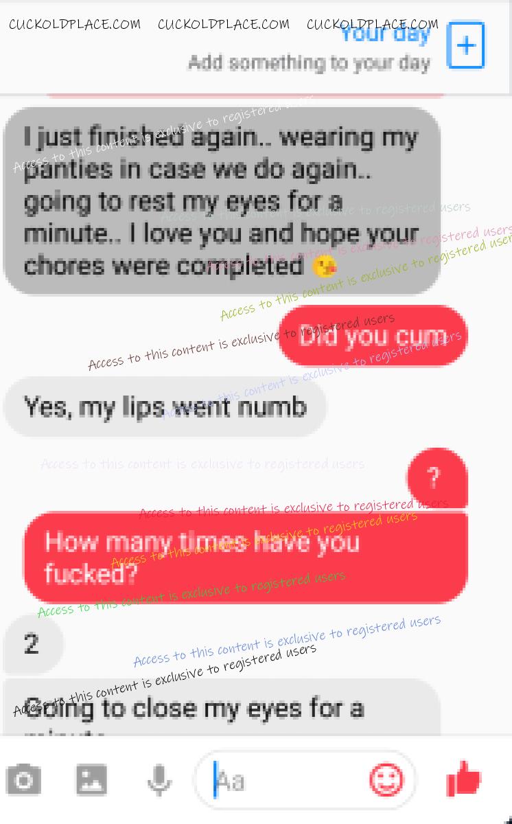 A week ago she was contacted by her ex lover on Facebook and he asked her if she was still married. He said he was looking for a "bootycall" and missed how great her pussy was. She entertained him a little but told me that was to turn me on knowing I have a cuckold fantasy. She said she could never fuck him. Two days ago things rapidly changed when he contacted her again. He once again told her he wanted to fuck her and this time she told him my fantasy. She said that my husband wants me to permanently deny him and take a lover. He responded he does not want to fuck you and she said he wants me to deny him forever because he is not man enough to fuck me. They had a fairly long chat where they discussed about what it was that they enjoyed when they fucked each other. It ended with him wanting to jackoff and her not comfortable enough YET to watch on Facebook video.